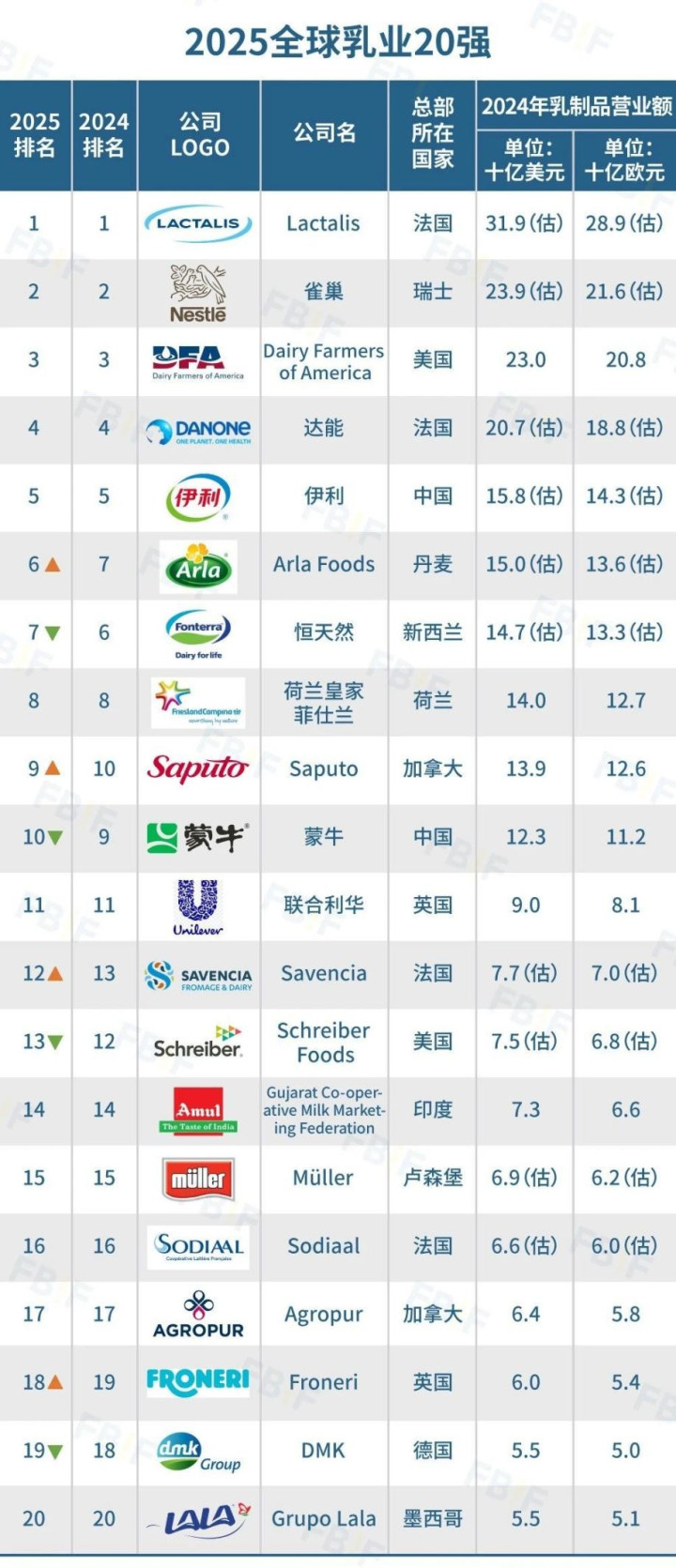 兰特黎斯(Lactalis)、雀巢(Nestlé)、美国奶农(DFA)、达能(Danone)分列前四,兰特黎斯连续第五年(2021-2025年)蝉联全球乳业第一,营业额达到319亿美元(约合人民币2275亿元)。