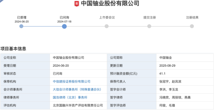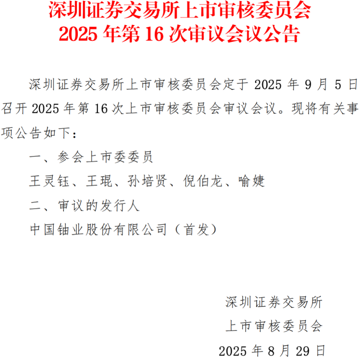 深交所上市审核委员会定于2025年9月5日召开2025年第16次上市审核委员会审议会议,审核中国铀业股份有限公司(首发)。