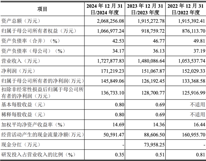 发行人2022年、2023年、2024年经审计的营业收入分别为1,053,537.74万元、1,480,086.64万元和1,727,877.83万元;2022年、2023年、2024年扣非前后归母净利润孰低者分别为125,916.99万元、126,192.45万元及136,733.10万元。